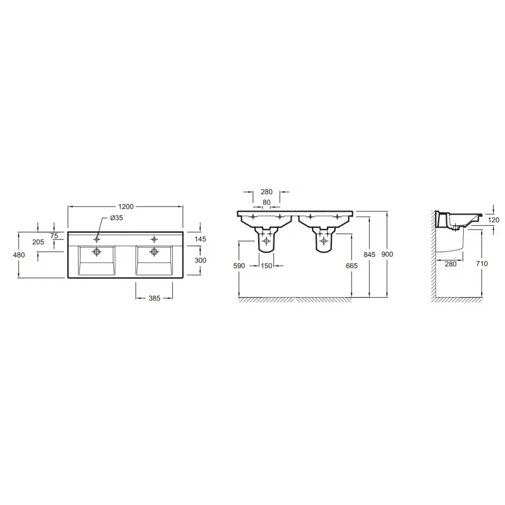 Технические характеристики Подвесная раковина Struktura 120х48х12 см, с 2 отверстиями под смеситель, санфарфор, двойная EXF112-00 Jacob Delafon