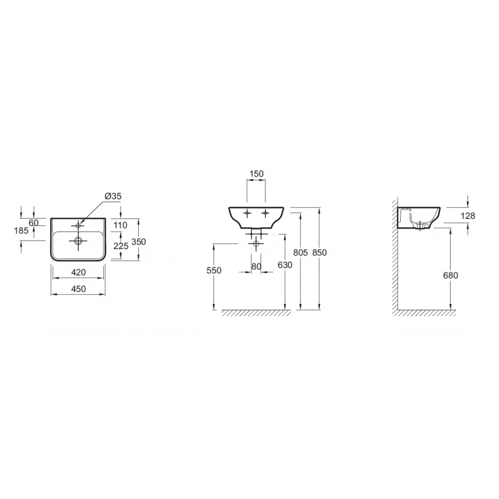 Технические характеристики Подвесная раковина Struktura 45х35х12,8 см, 1 отв. под смеситель, с переливом, с гладкой нижней поверхностью, санфарфор EGH112-Z-00 Jacob Delafon