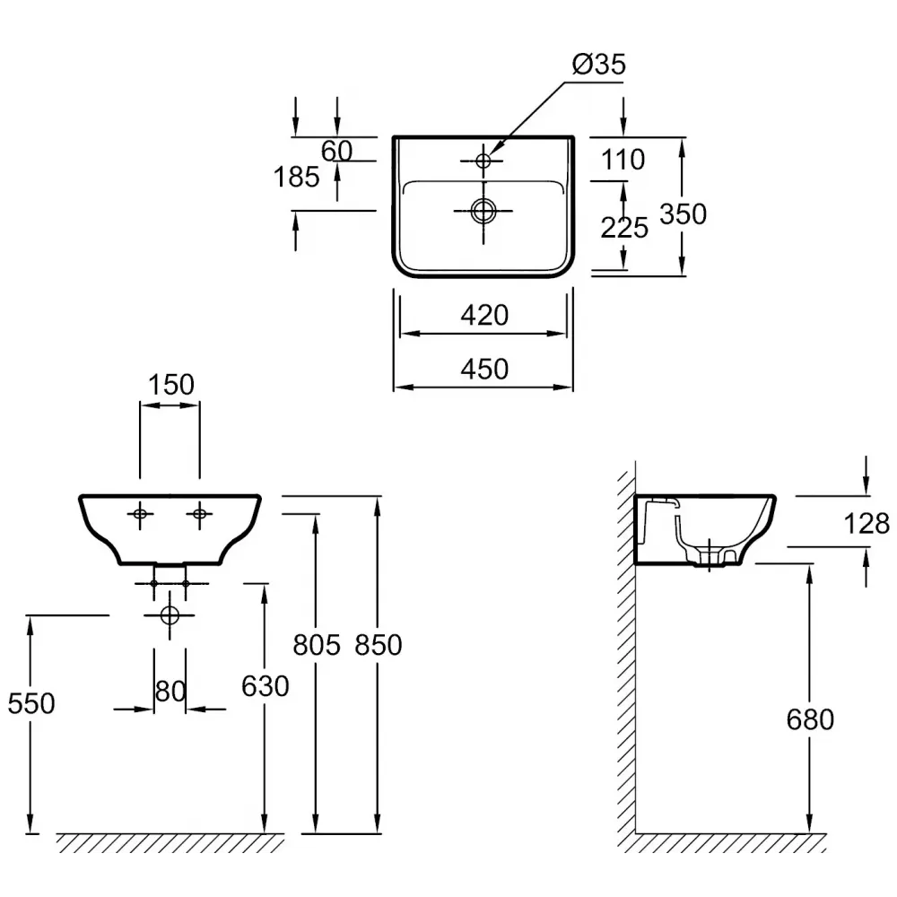 Технические характеристики Подвесная раковина Struktura 45х35х12,8 см, с отверстием перелива, санфарфор EGH111-00 Jacob Delafon