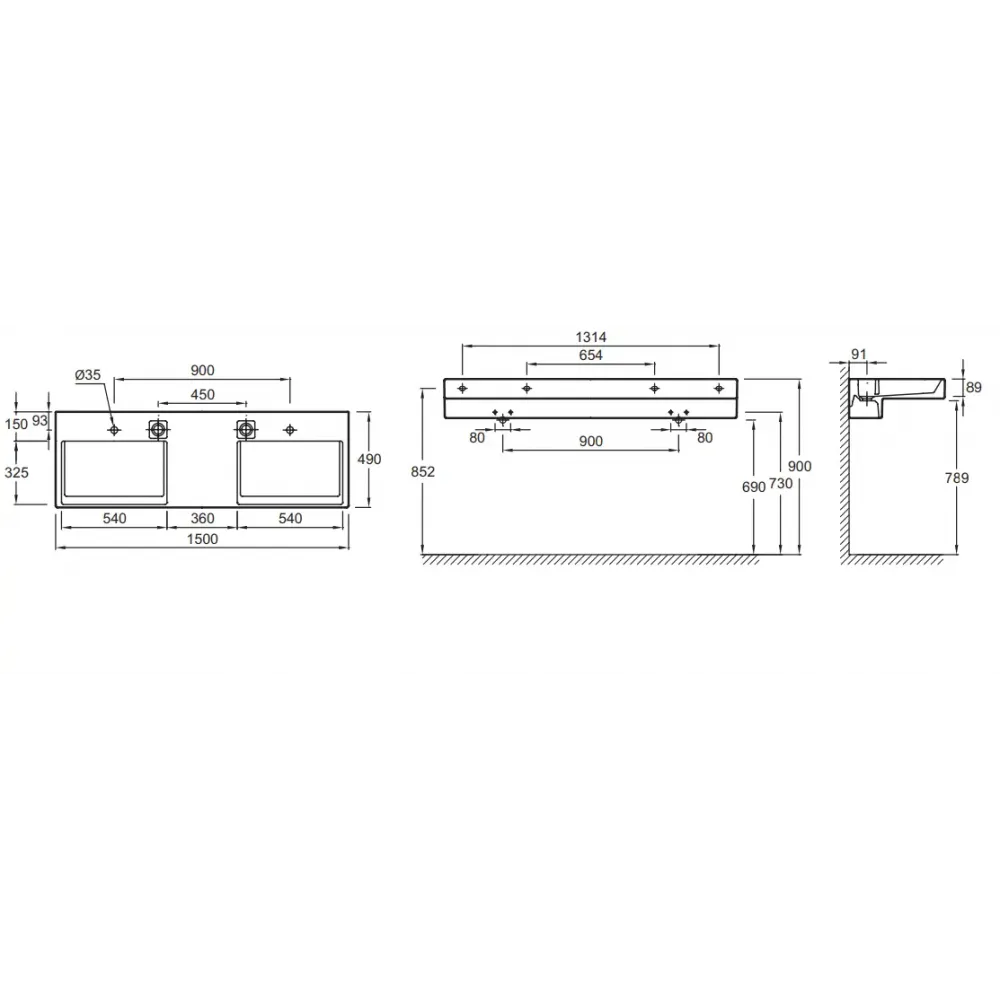 Технические характеристики Подвесная раковина Terrace 150х49х8,9 см, c подсветкой, 2 отверстия для смесителя справа и слева, система слива freedrain, санфарфор, двойная EXA9112-00 Jacob Delafon