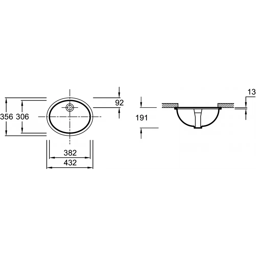 Встраиваемая раковина 43 х 36 см с переливным отверстием, устанавливаемая снизу.