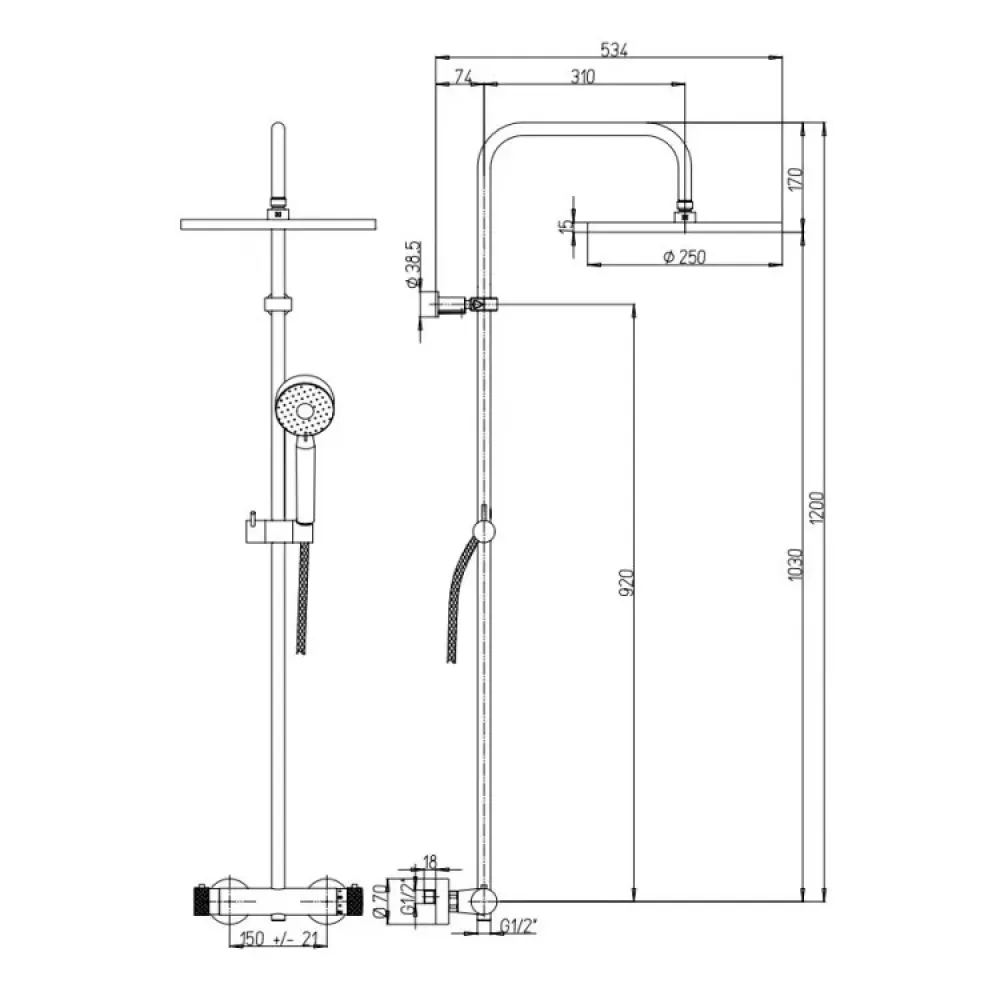 Душевая система, включающая в себя: термостатический смеситель, телескопическую штангу с регулировкой по высоте, верхний душ и ручную лейку со шлангом.