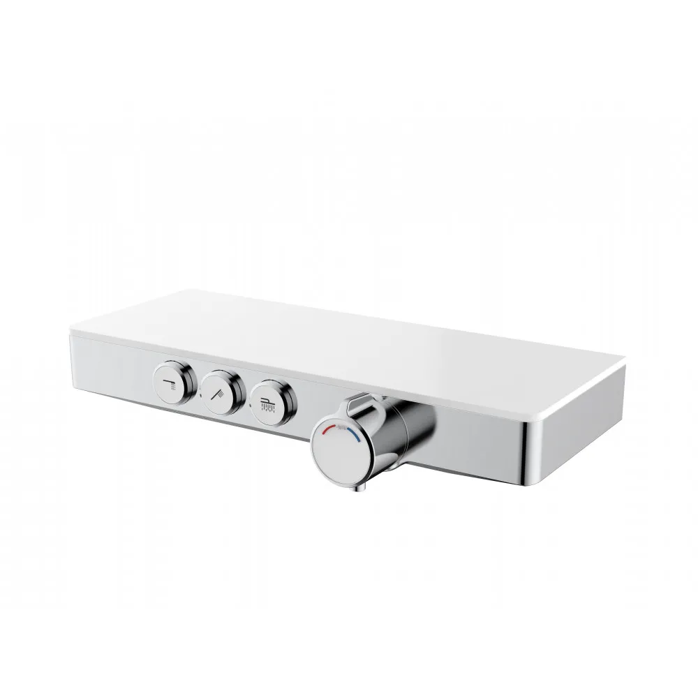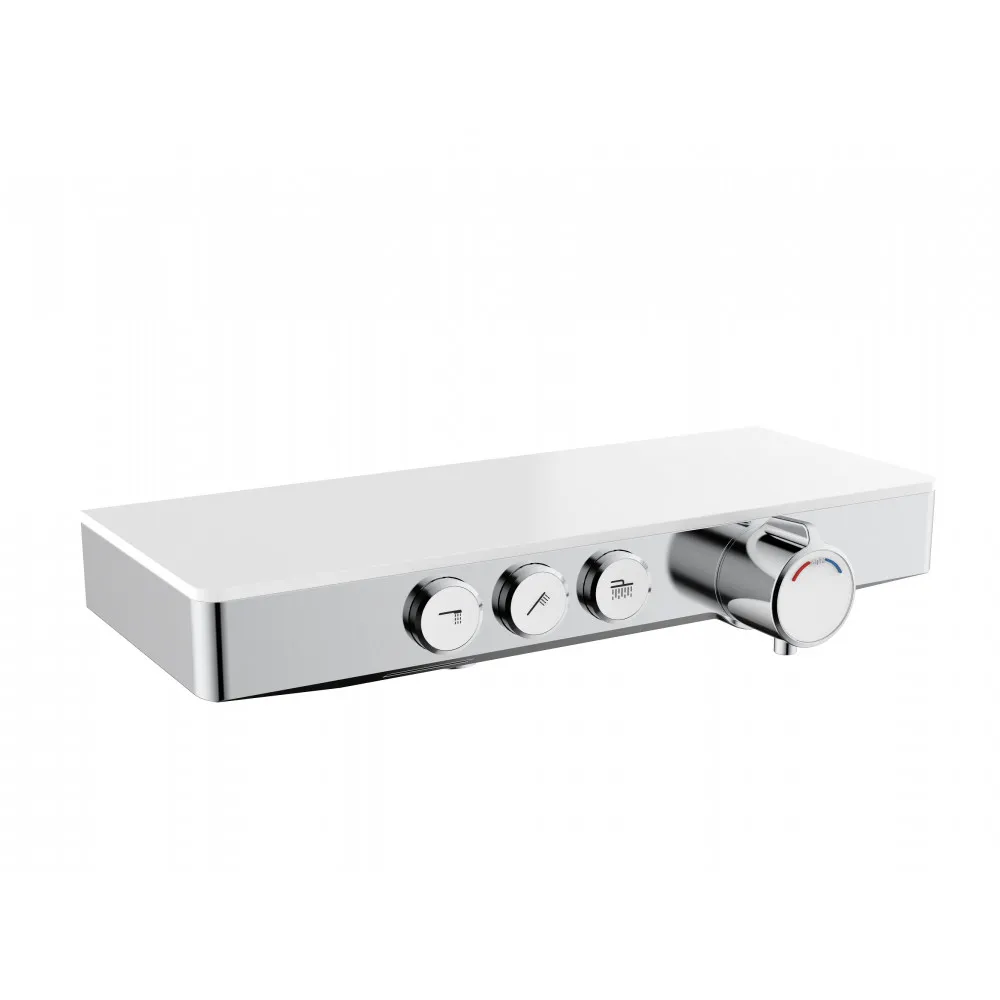 Форма корпуса смесителя выполнена в виде полочки из закаленного стекла, позволяя комфортно хранить необходимые принадлежности для душа.