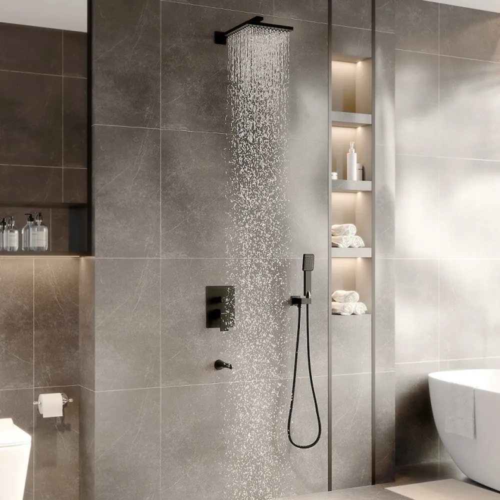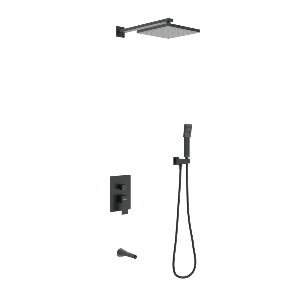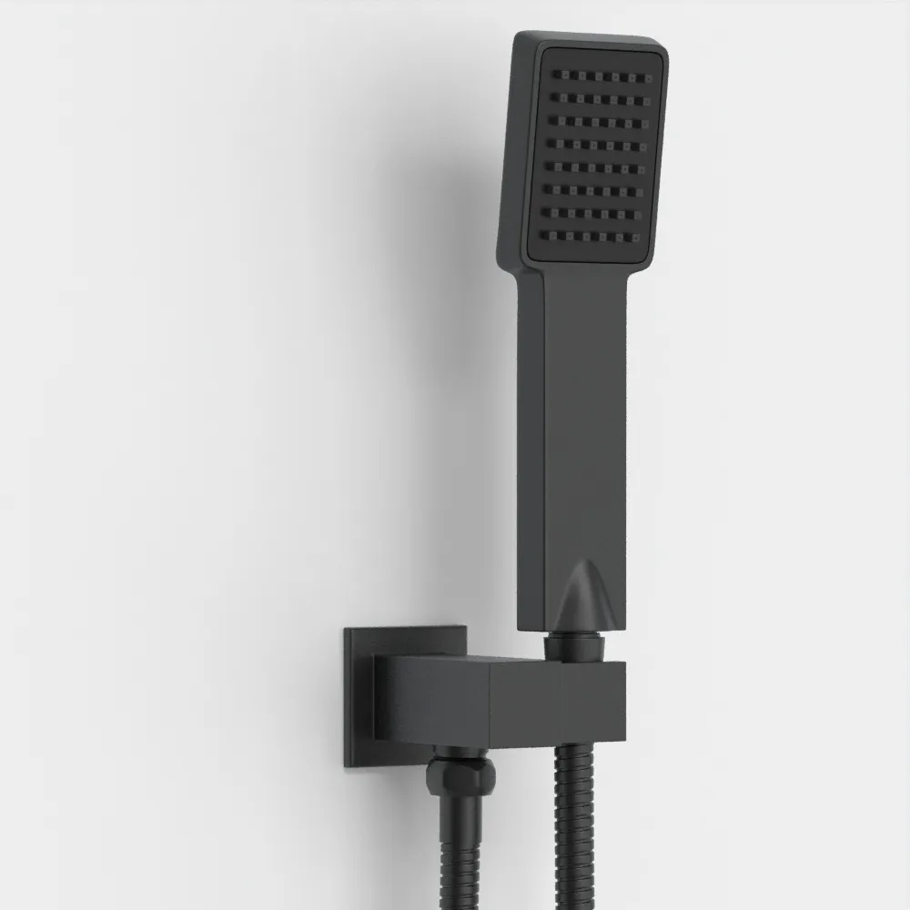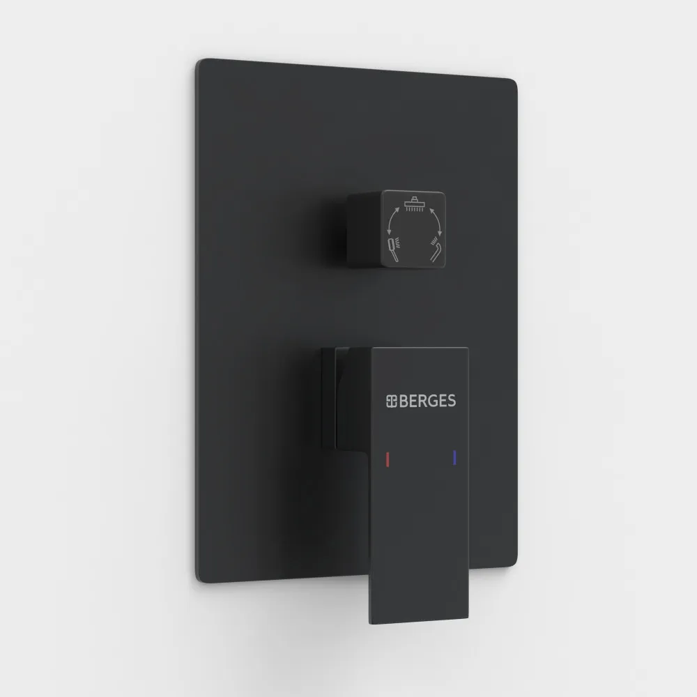 Душевой комплект BERGES NARDIS 3S BLACK - встраиваемый душевой комплект обладает трёхрежимной системой и состоит из верхней лейки - «тропического ливня», ручного душа, излива и смесителя. Лейка верхнего душа имеет инновационную систему самоочистки в виде гибких силиконовых вставок на форсунках душа, которые защищают изделие от известковых отложений. Изготовлены оба душа из ABS пластика. Комплект имеет матовое черное покрытие, которое выглядит безупречно на протяжении всего периода эксплуатации. Шланг выполнен из нержавеющей стали (внутри epdm), смеситель с латунным корпусом имеет керамический картридж с пропускной способностью 28 л/мин, все держатели и кронштейны сделаны из латуни и нержавеющей стали.