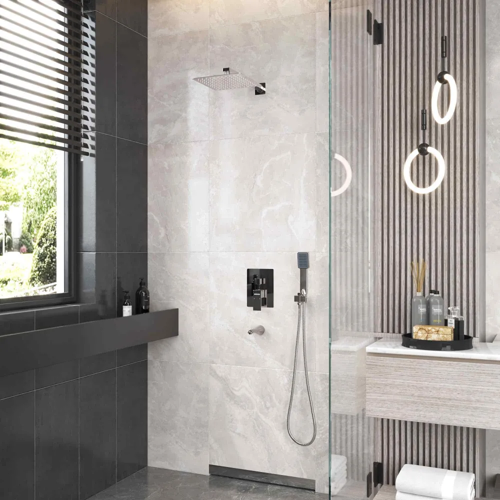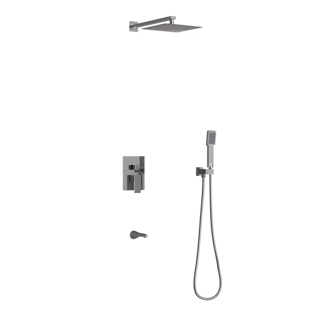 Душевой комплект BERGES VENTAS 3S - встраиваемый душевой комплект обладает трёхрежимной системой и состоит из верхней лейки - «тропического ливня», ручного душа, излива и смесителя.