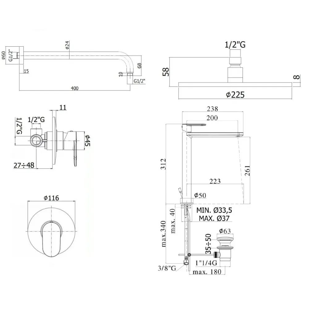 • ZSOF063BO Настен. Крепление верх. душа mm.400 QUADRO Paffoni латунь