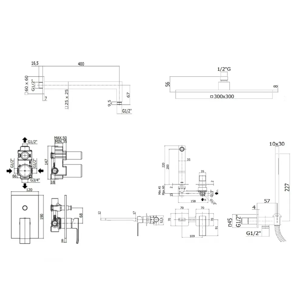 Комплект KITEL015CR105KING со встраиваемым смесителем для раковины EL105cR0, смеситель для душа EL015NO/M на 2 выхода, душ 300x300мм, ELLE, хром Paffoni
