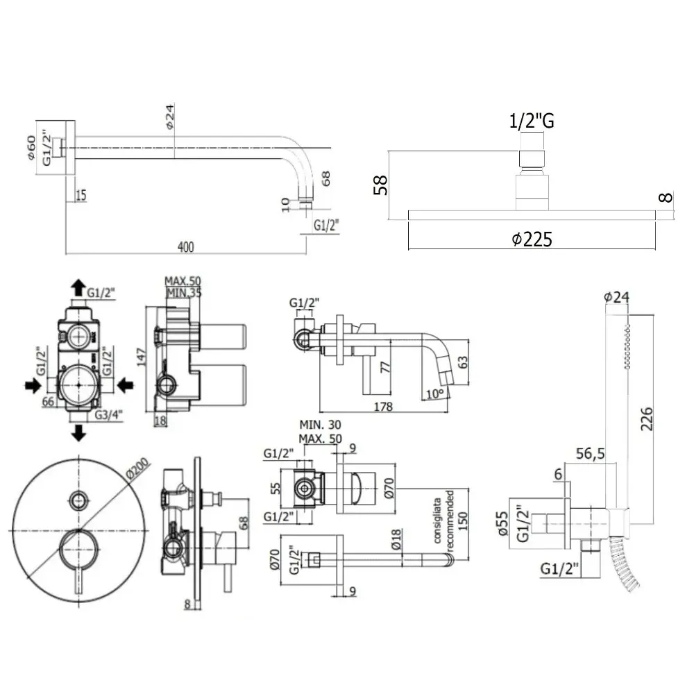 Комплект KITLIG015HG006 со встраиваемым смесителем для раковины LIG006HG70, смеситель для душа LIG015HG на 2 выхода, душ 225мм, LIGHT, медовое золото- 1 шт