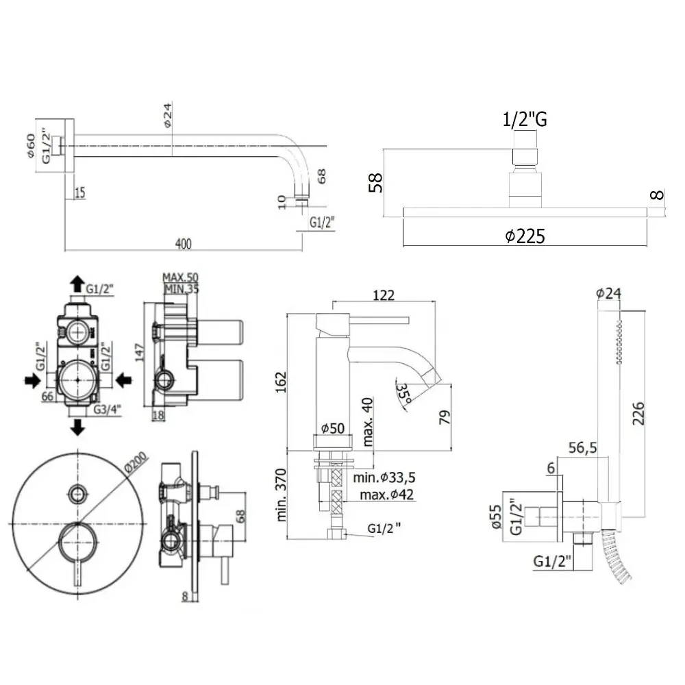 Комплект KITLIG015HG071 со смесителем для раковины LIG071HG, смеситель для душа LIG015HG на 2 выхода, душ 225мм, LIGHT, медовое золото, Paffoni