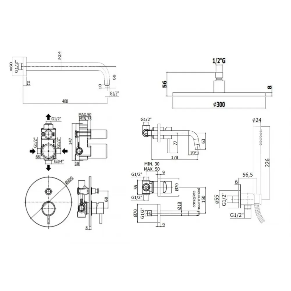 Комплект KITLIG015HGSP006KING со встраиваемым смесителем для раковины LIG006HGSP70, смеситель для душа LIG015HGSP на 2 выхода, душ 300мм, LIGHT, медовое золото брашированное