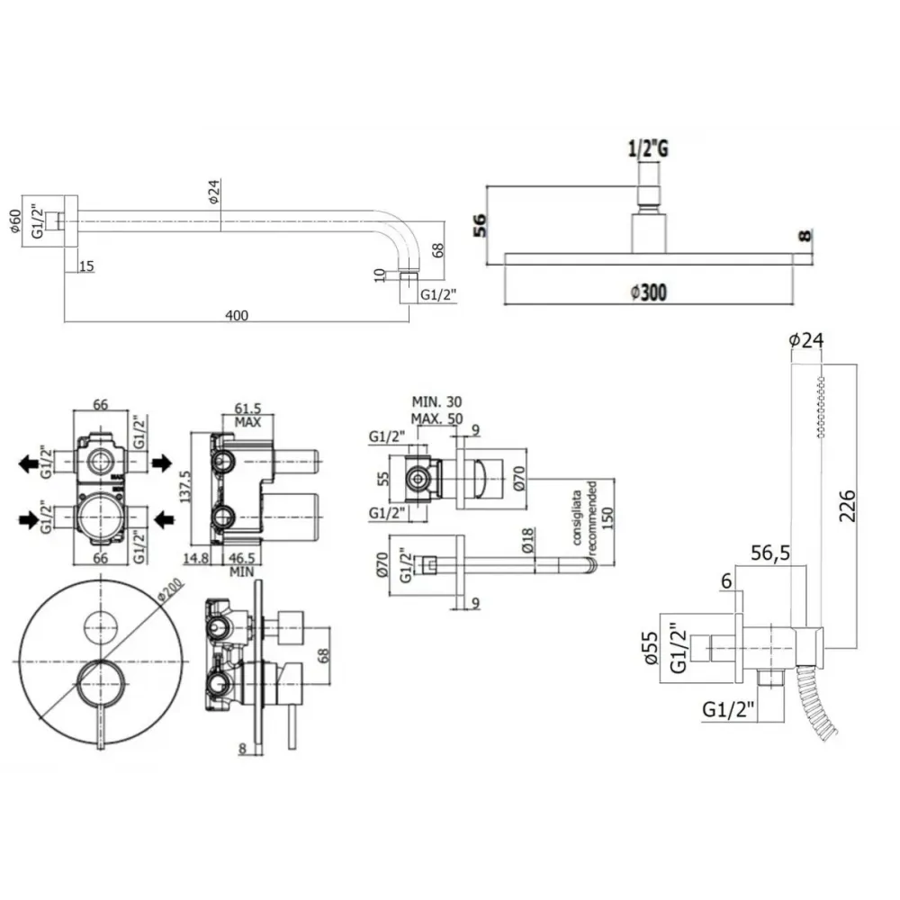 Комплект KITLIQ018CR006KING со встраиваемым смесителем для раковины LIG006CR70, смеситель для душа LIQ018CR термостатический на 2 выхода, душ 300мм, LIGH