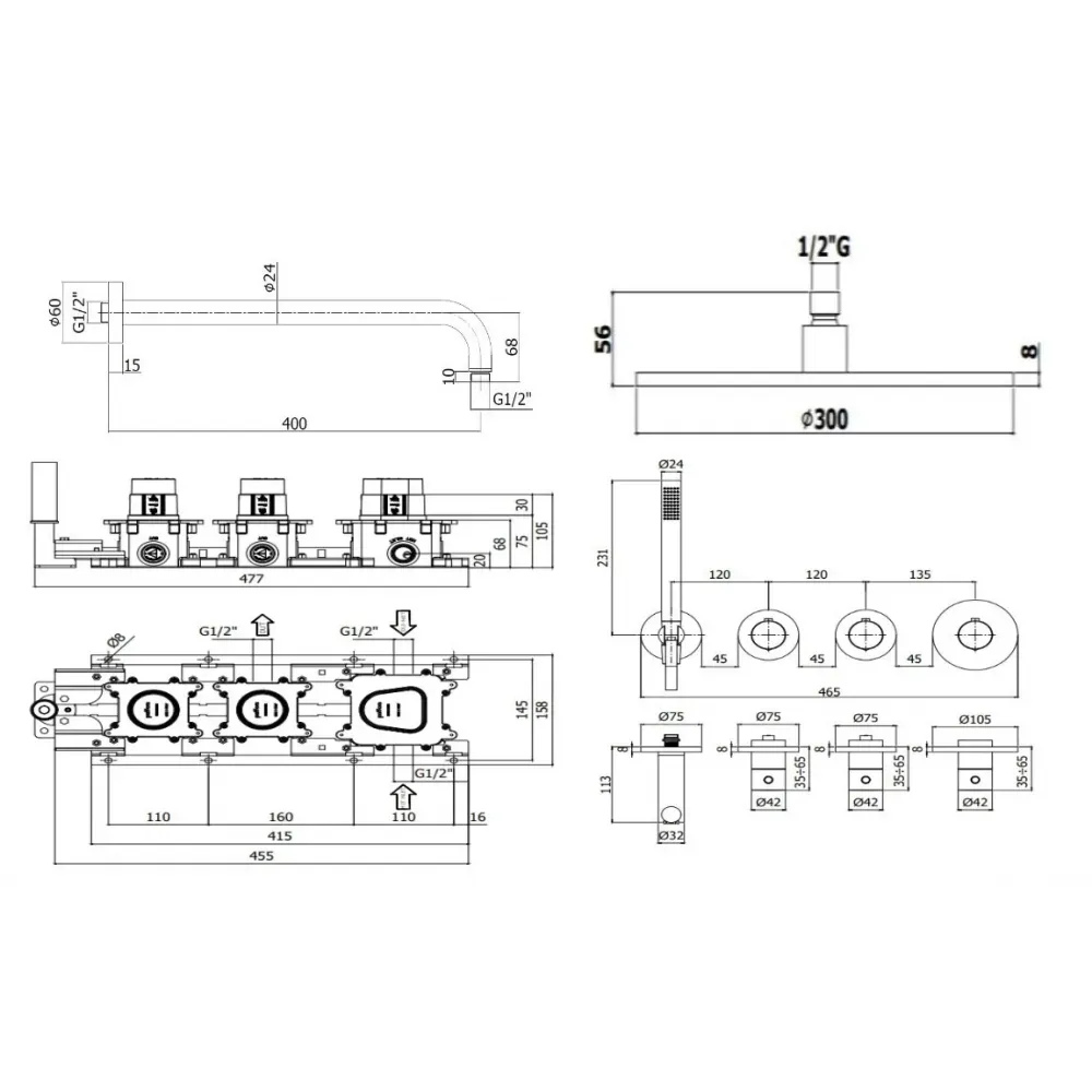 • MDE000NO Внешняя часть смесителя ТЕРМОСТАТ на 2 выхода, в комплекте с ручным душем, для использования только с арт. MDBOX000, расположение ТОЛЬКО гориз