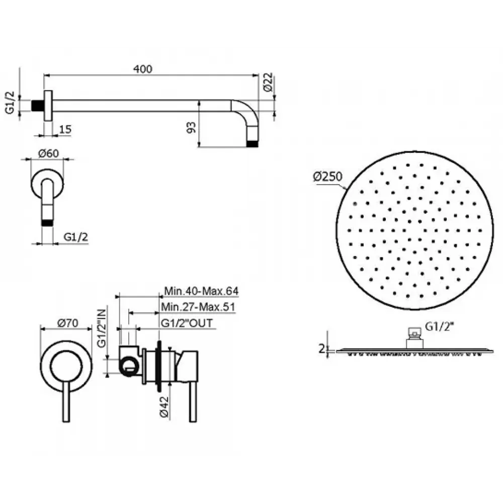 Комплект KITXO01NO для душа, со смесителем KITXO1135NO на 1 выход, душ 250мм, IXO, Plumberia Selection