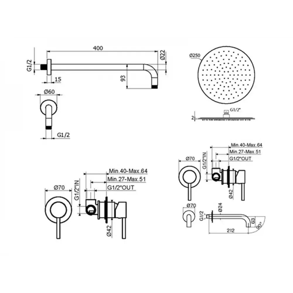 - KITXO1135RS210 Комплект встраиваемого смесителя для раковины, излив 210мм, накладка диам. 70мм, внутренняя часть INT1135 в комплекте, медь брашированная IXO, SAT3130RS Настенное крепление верхнего душа 400мм из нержавеющей стали, брашированная медь, Plumberia Selection