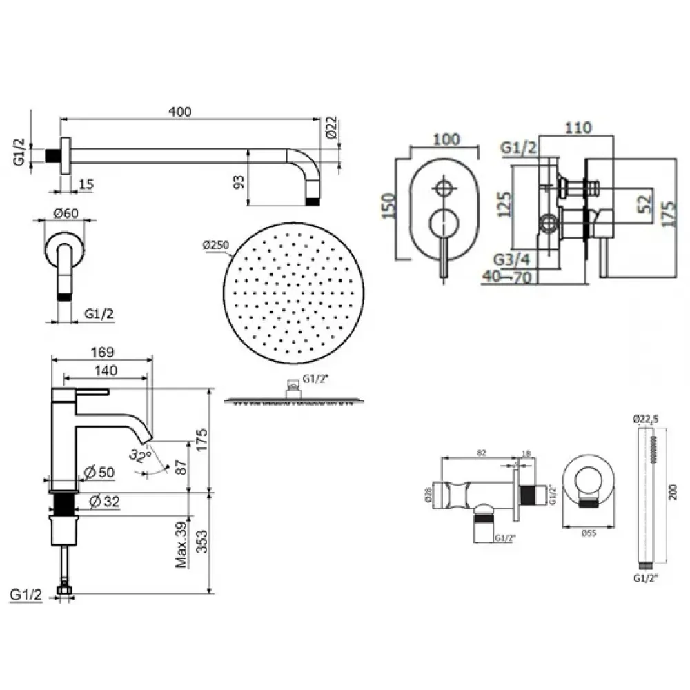 Комплект KITXO15NO53 со встраиваемым смесителем для раковины XO0053NO, смесителем для душа KIT1001NO на 2 выхода, душ 250мм, IXO, черный матовый Plumberia Selection