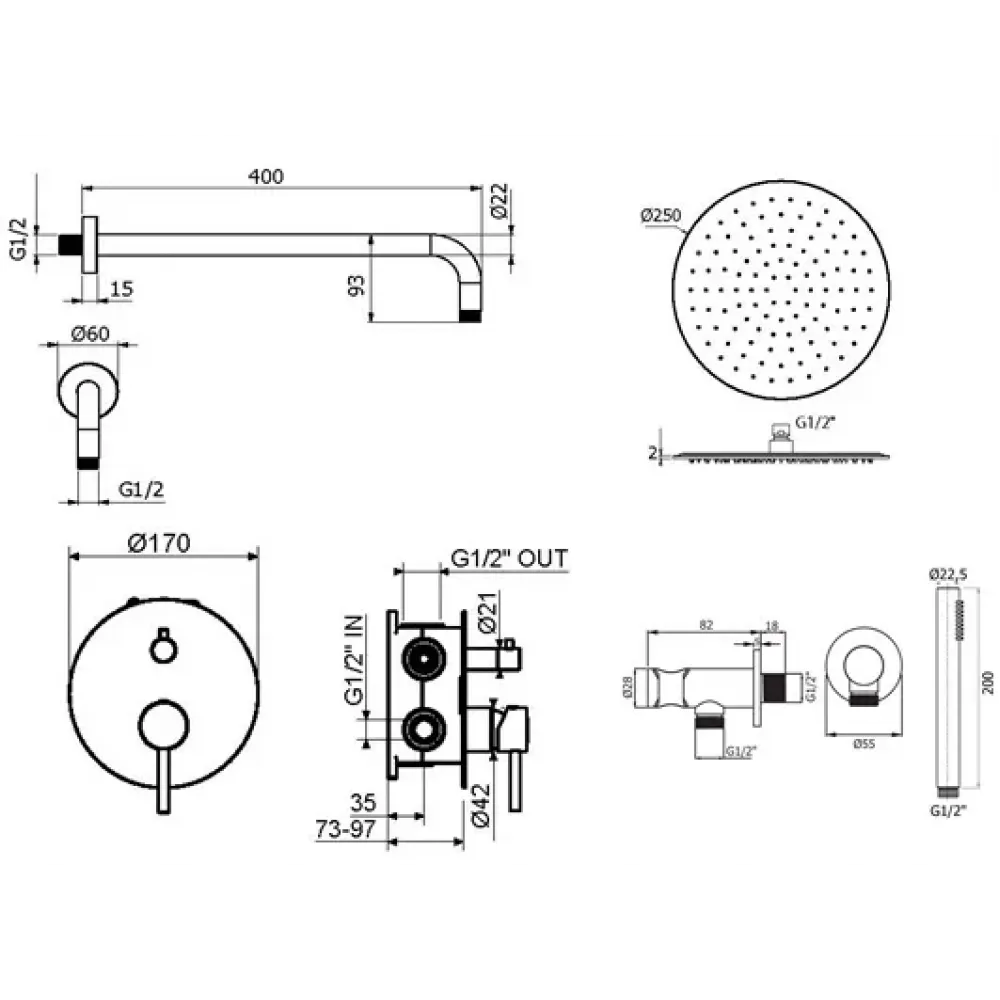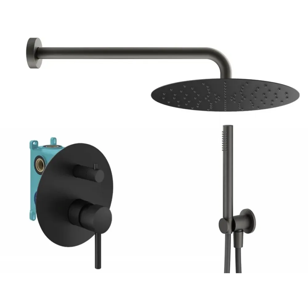 - KIT1901NO Комплект встраиваемого смесителя для душа с внутренней частью INT9036 на 2-3 выхода, накладка d. 170mm нержавеющая сталь, механический девиатор, черный матовый IXO, Plumberia Selection