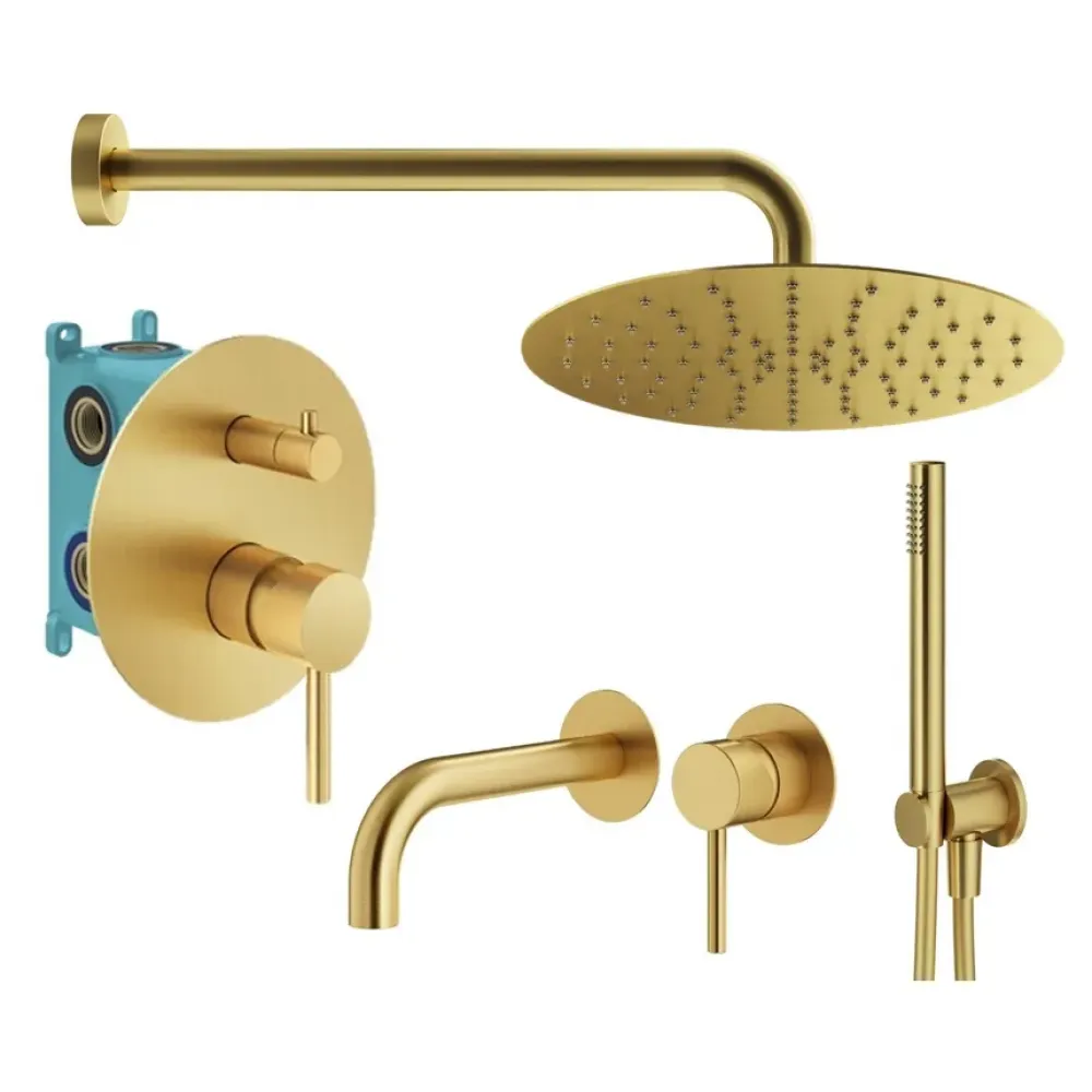 - KITXO1135OB210 Комплект встраиваемого смесителя для раковины, излив 210мм, накладка диам. 70мм, внутренняя часть INT1135 в комплекте, золото брашированное IX KIT1901OB Комплект встраиваемого смесителя для душа с внутренней частью INT9036 на 2-3 выхода, накладка d. 170mm нержавеющая сталь, механический девиатор, брашированное золото IXO, Plumberia Selection