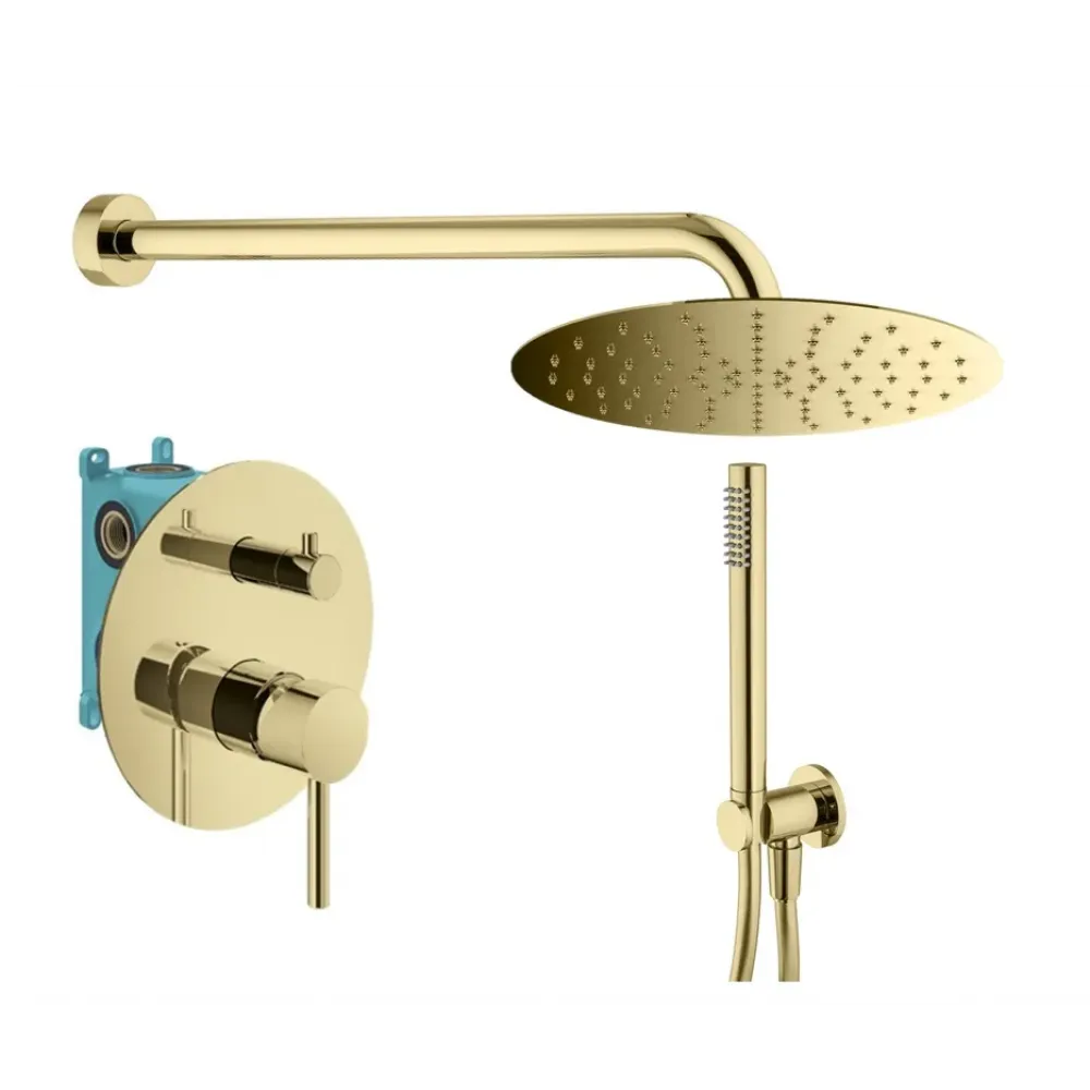 - KIT1901OR Комплект встраиваемого смесителя для душа с внутренней частью INT9036 на 2-3 выхода, накладка d. 170mm нержавеющая сталь, механический девиатор, золото IXO, Plumberia Selection