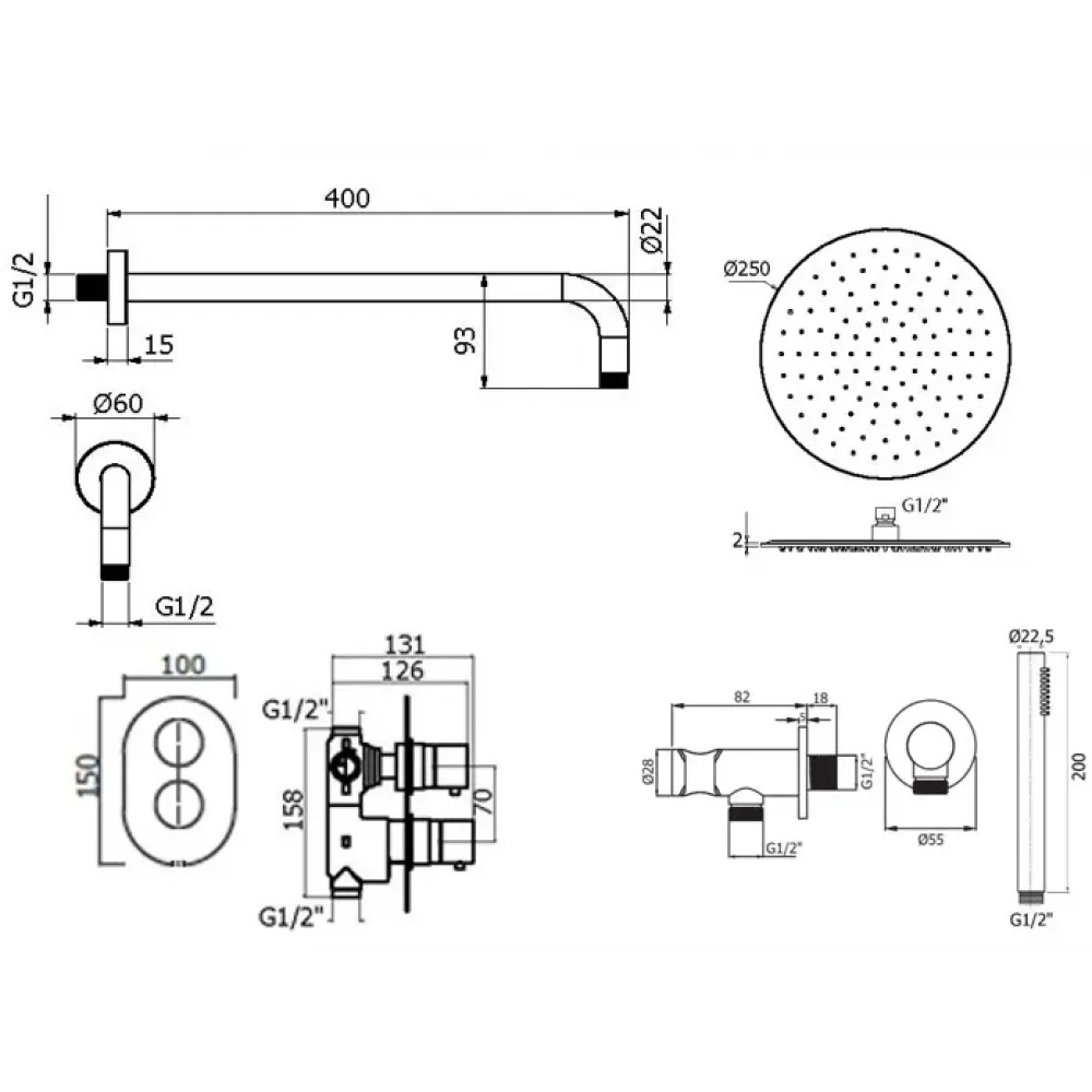 Комплект KITXOT18CR для душа термостатический, со смесителем XOT5040CR на 2 выхода, душ 250мм, IXO, хром Plumberia Selection