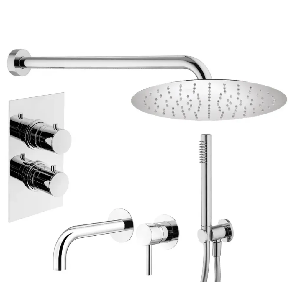 - KITXO1135CR210 Комплект встраиваемого смесителя для раковины, излив 210мм, накладка диам. 70мм, внутренняя часть INT1135 в комплекте, хром IXO, Plumberia Sel XOT5020CR Смеситель термостат встраиваемый для душа 2 выход в комлекте со встраиваемой частью, накладка из нержавеющей стали, хром, Plumberia Selection