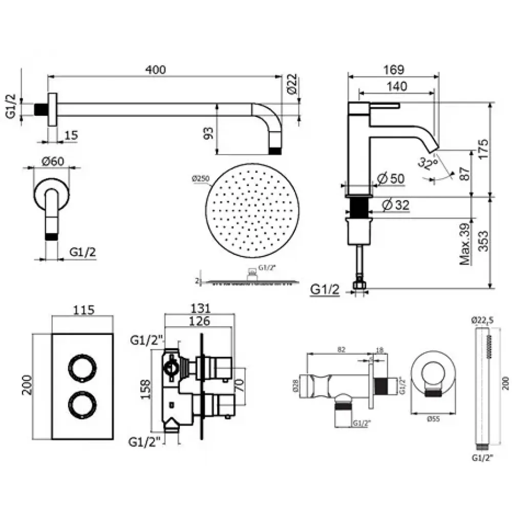 Комплект KITXOT18QCR53 со смесителем для раковины XO0053CR, смесителем для душа XOT5020CR термостатическим на 2 выхода, душ 250мм, IXO, хром Plumberia Selection