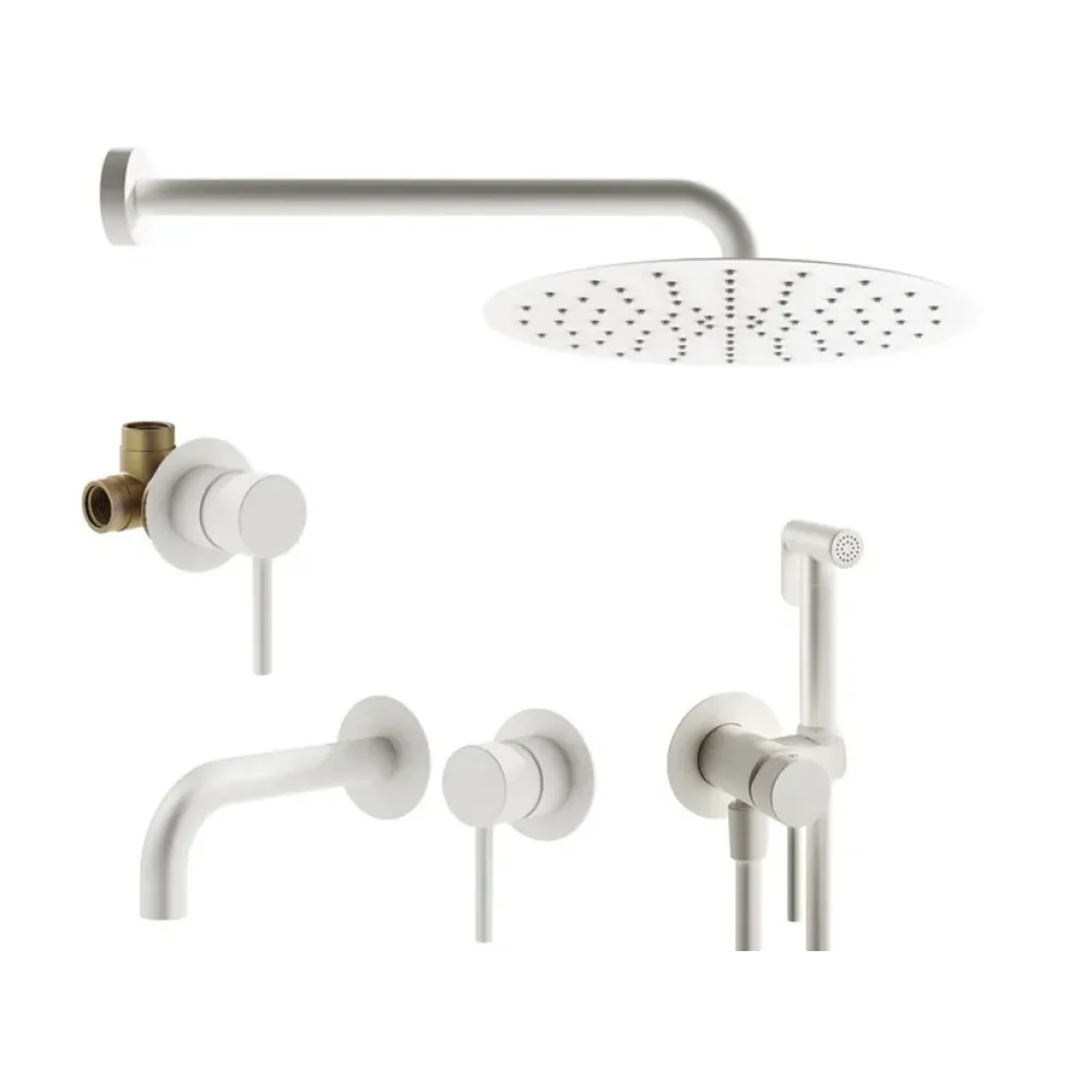 Комплект KITZXO01BO210 с гигиеническим душем, смесителем для раковины KITXO1135BO210, смесителем для душа KITXO1135BO на 1 выход, душ 250мм, IXO, белый матовый Plumberia Selection