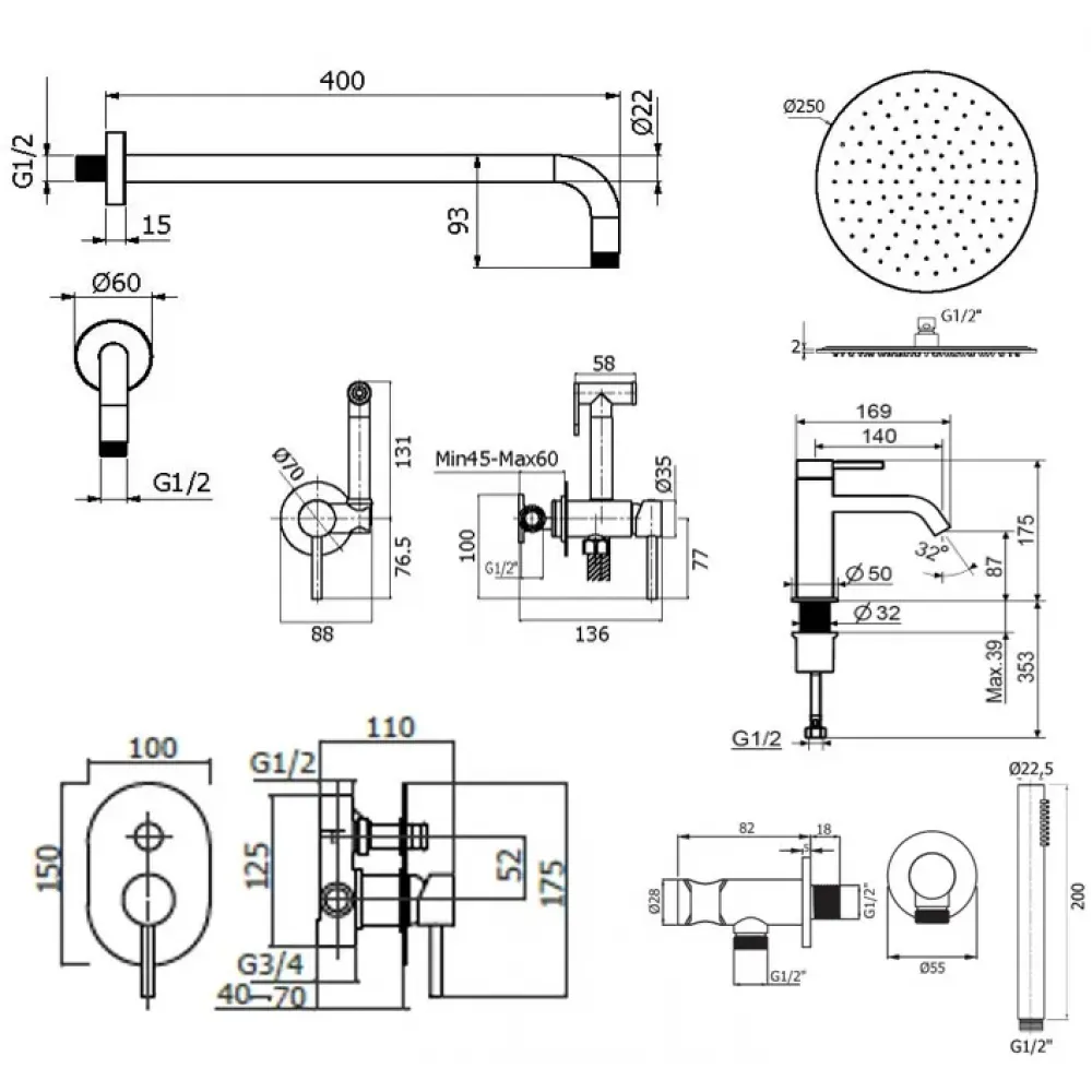 Комплект KITZXO15CR53 с гигиеническим душем, со смесителем для раковины XO0053CR, смес. для душа KIT1001CR на 2 выхода, душ 250мм, IXO, хром Plumberia Selection