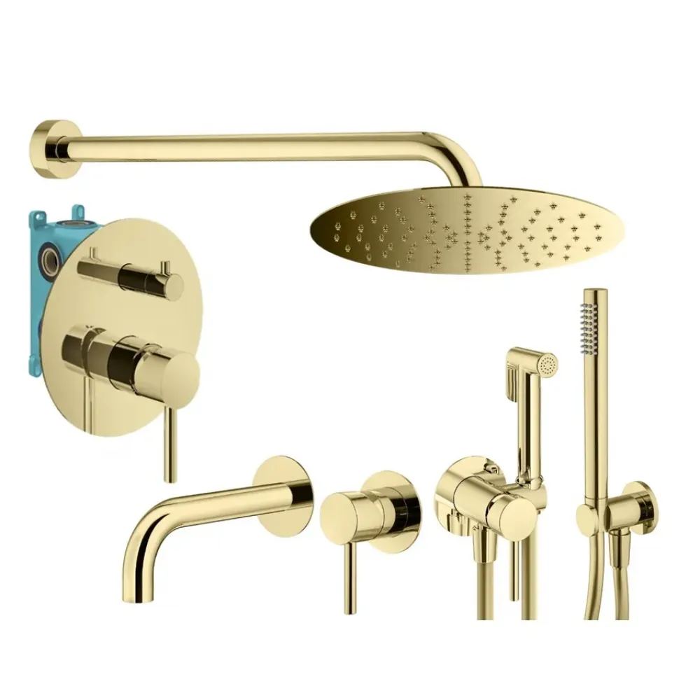 Комплект KITZXO18OR210 с гигиеническим душем, со встраиваемым смесителем для раковины KITXO1135OR210, смесителем для душа KIT1901OR на 2 выхода, душ 250мм, IXO, золото Plumberia Selection