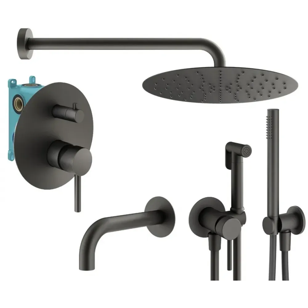 - KIT1901GR Комплект встраиваемого смесителя для душа с внутренней частью INT9036 на 2-3 выхода, накладка d. 170mm нержавеющая сталь, механический девиатор, графит IXO, Plumberia Selection
