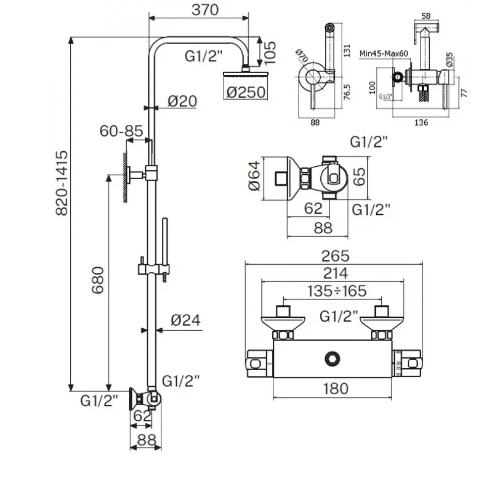 - XO6302NO Душевая колонна телескопическая терм., поворотная, Верхний душ из нержавеющей стали 250мм, ручной душ 1 режим, шланг 150мм, черный матовый IXO, Plumberia Selection