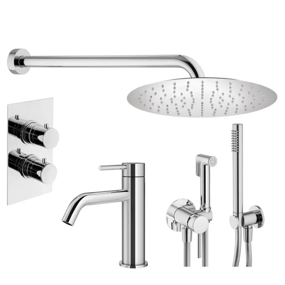 Комплект KITZXOT18QCR53 с гигиеническим душем, со смесителем для раковины XO0053CR, смесителем для душа XOT5020CR термостатический на 2 выхода, душ 250мм, IXO, хром Plumberia Selection