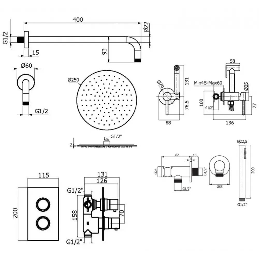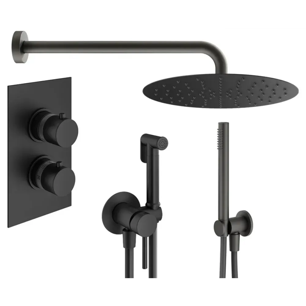 Комплект KITZXOT18QNO с гигиеническим душем, для душа термостатический, со смесителем XOT5020NO на 2 выхода, душ 250мм, IXO, черный матовый Plumberia Selection