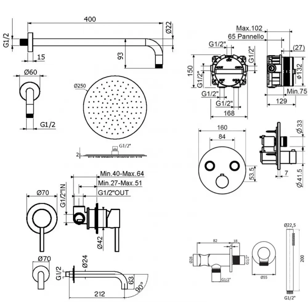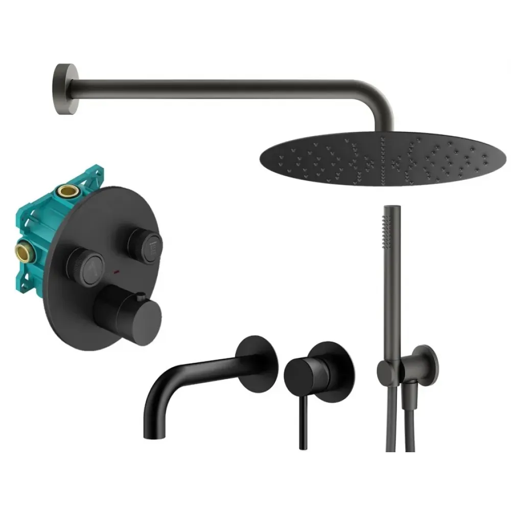 Комплект KITPSB02NO210 для душа термостатический, со встраиваемым смесителем для раковины KITXO1135NO210, смесителем для душа KITPSB1902NO на 2 выхода, душ 250мм, PS BOX, черный матовый Plumberia Selection