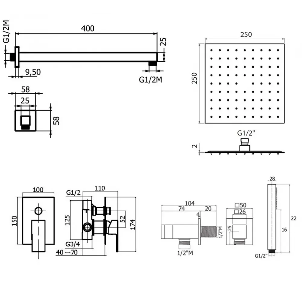 - SAQ3114NO Верхний душ 250X250 из нержавеющей стали, встроенный клапан безопасности, поворотное крепление, антикальций, 2мм, черный матовый, Plumberia Selection.