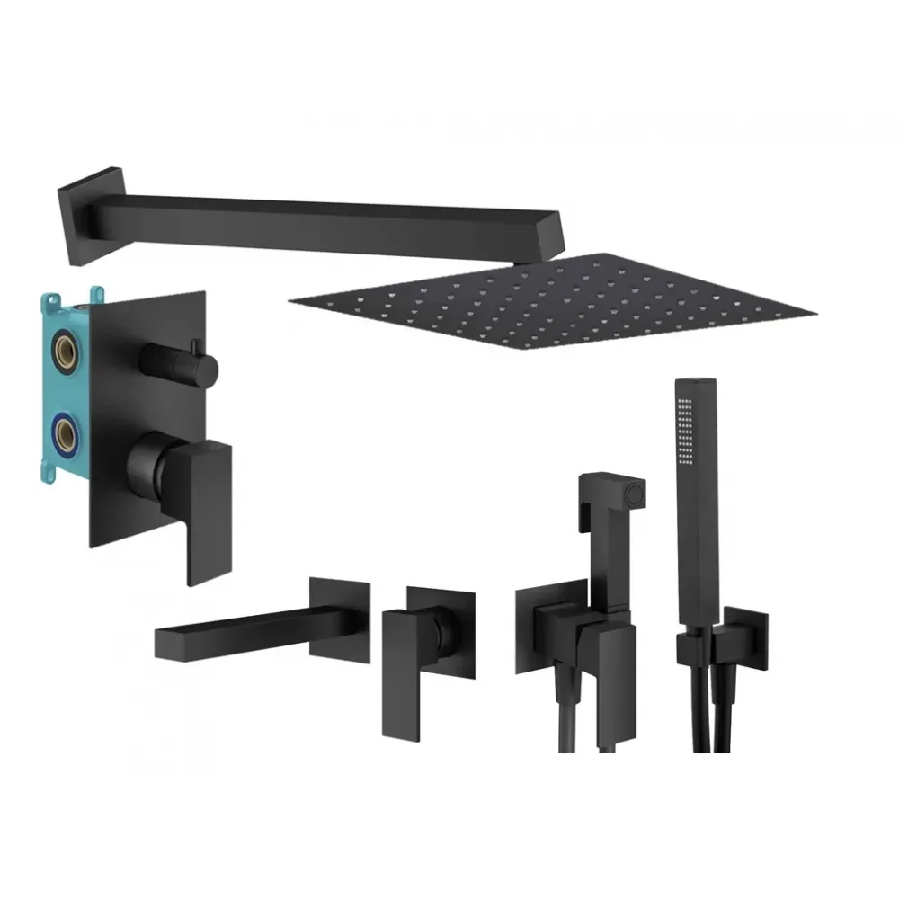 Комплект KITZTG18NO220 с гигиеническим душем, со встраиваемым смесителем для раковины KITTG1135NO220, смесителем для душа KITTG1901NO на 2 выхода, душ 250x250мм, TAG, черный матовый Plumberia Selection