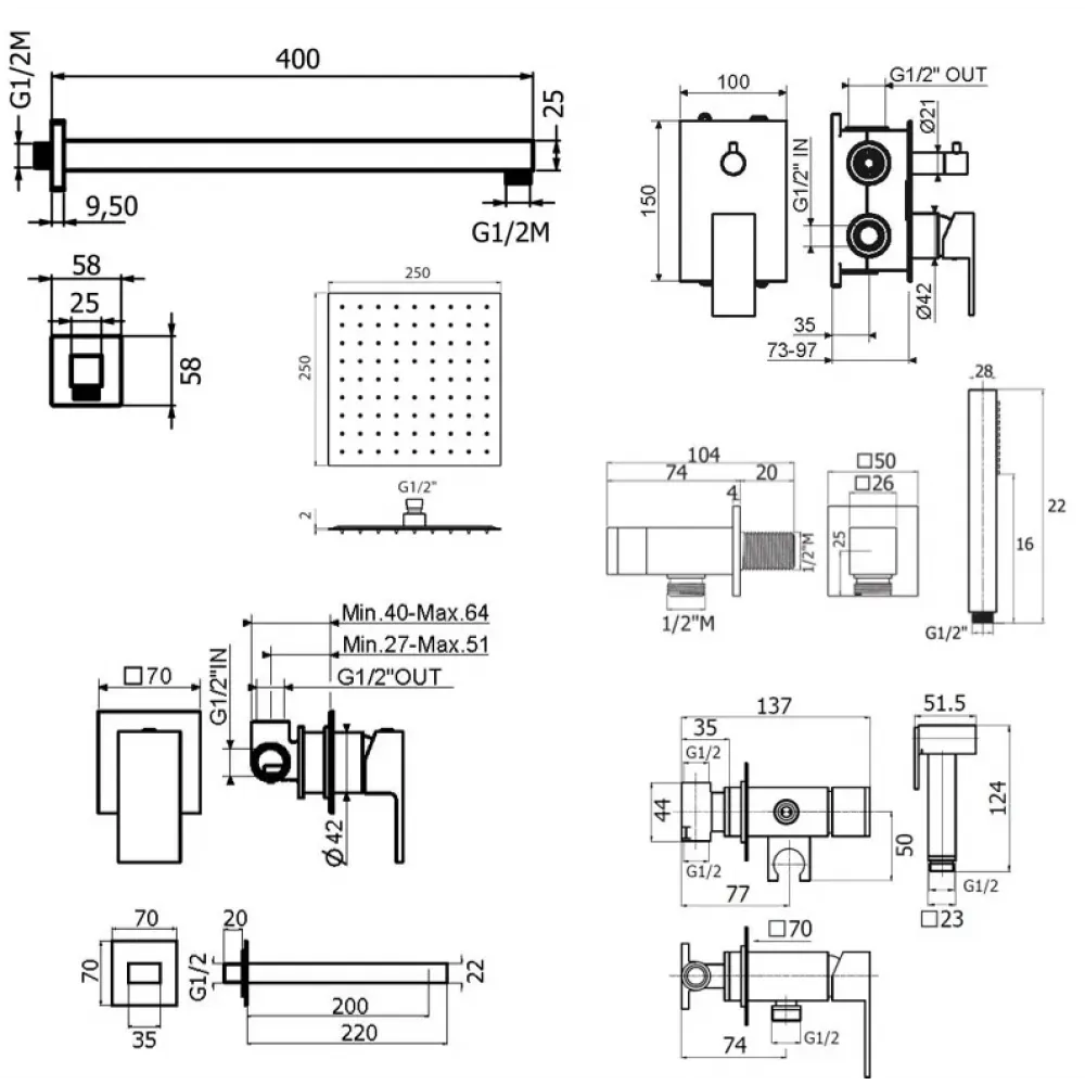 - KITTG1901NO Комплект встраиваемого смесителя для душа с внутренней частью INT9036 на 2-3выхода, накладка 100X150mm нержавеющая сталь, механический девиатор, черный матовый TAG, Plu HST3108NO Комплект ручного душа, водорозетка с запорным клапаном и держателем, душ квадратный латунь 1 режим антикальц., шланг PVC 1500мм, черный матовый, Plumberia Selection