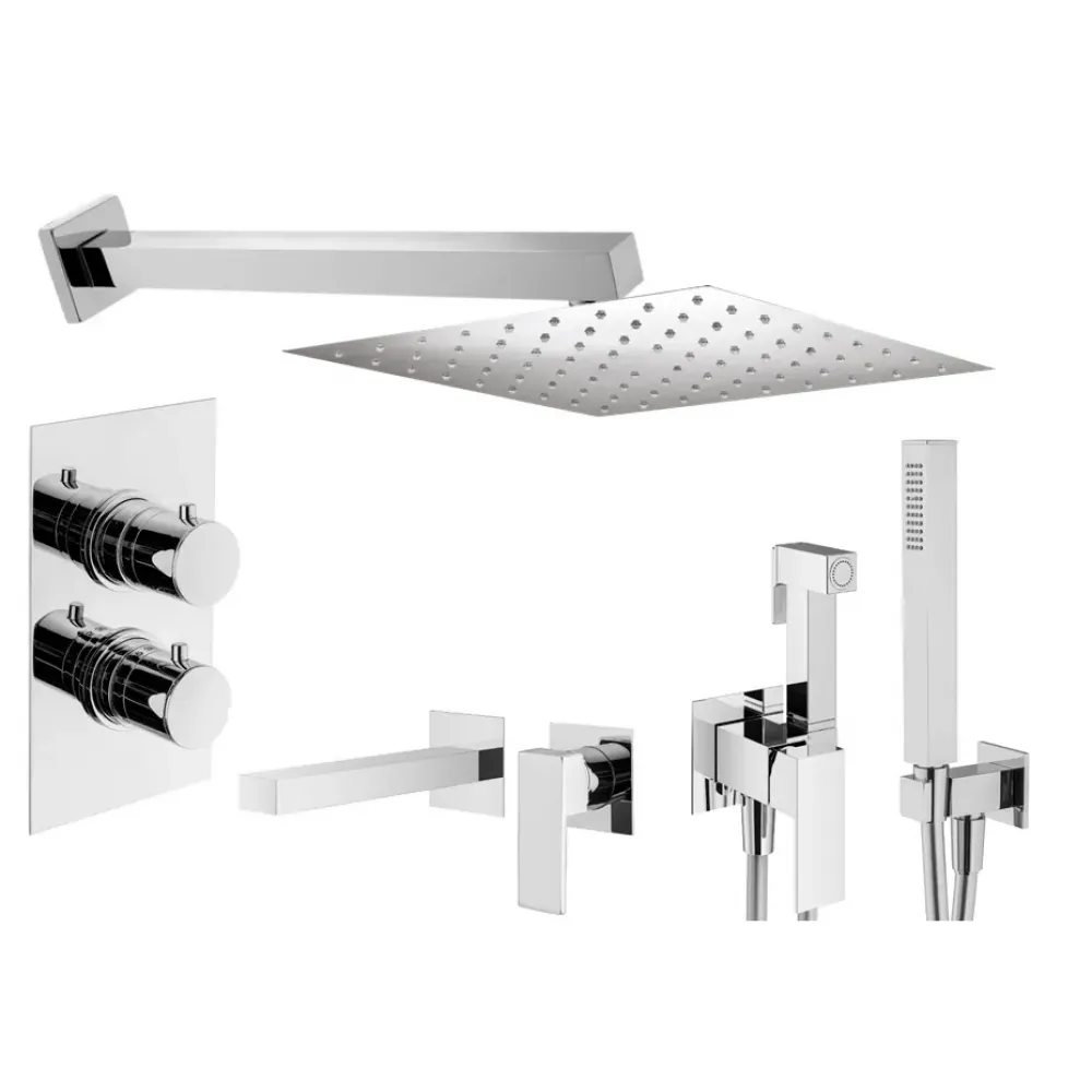 Комплект KITZTGT18QCR220 с гигиеническим душем, со встраиваемым смесителем для раковины KITTG1135CR220, смесителем для душа XOT5020CR термостатический на 2 выхода, душ 250x250мм, TAG, хром Plumberia Selection