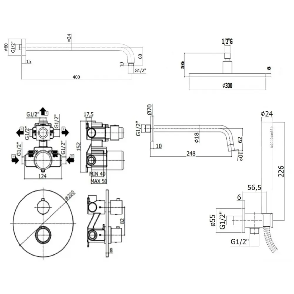 • LIQ019BO Смеситель термостат встраиваемый для душа 3 выход с накл.металл диам.200мм, девиатор-картридж, 3 положения+3 комбо со стоп, белый матовый, Pa