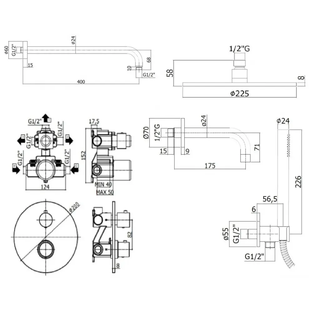• LIQ019BO Смеситель термостат встраиваемый для душа 3 выход с накл.металл диам.200мм, девиатор-картридж, 3 положения+3 комбо со стоп, белый матовый, Pa