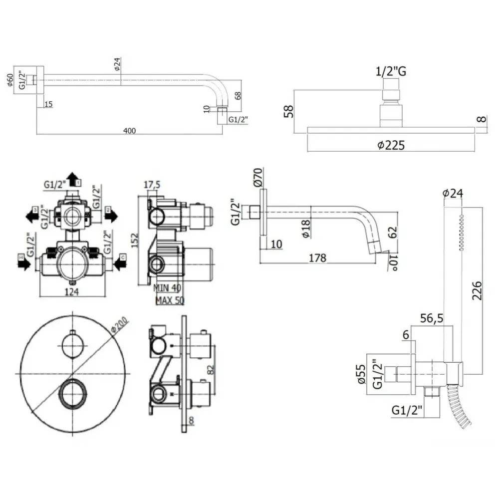 Комплект KITLIQ019CR045 для ванны с изливом 175мм, смеситель LIQ019CR термостат на 3 выхода, душ 225мм, LIGHT, хром Paffoni