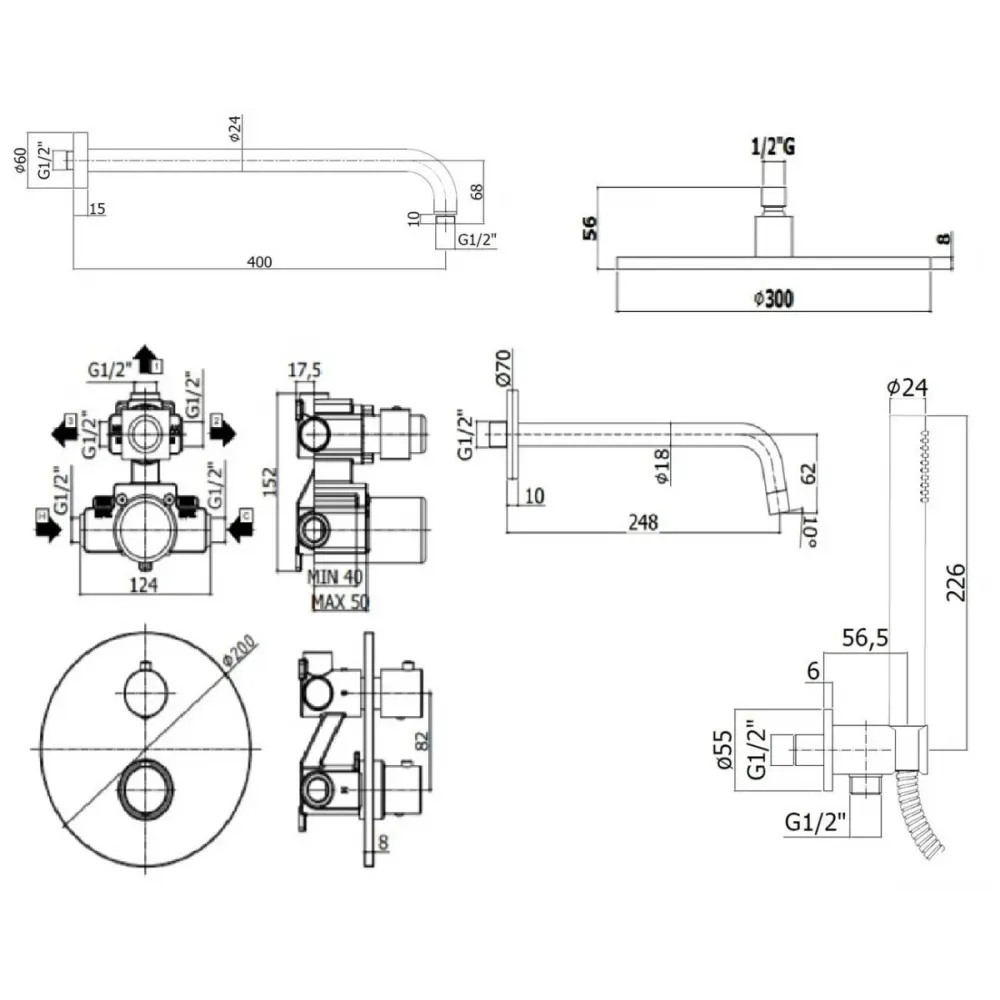 Комплект KITLIQ019CR046KING для ванны с изливом 245мм, смеситель LIQ019CR термостат на 3 выхода, душ 300мм, LIGHT, хром Paffoni