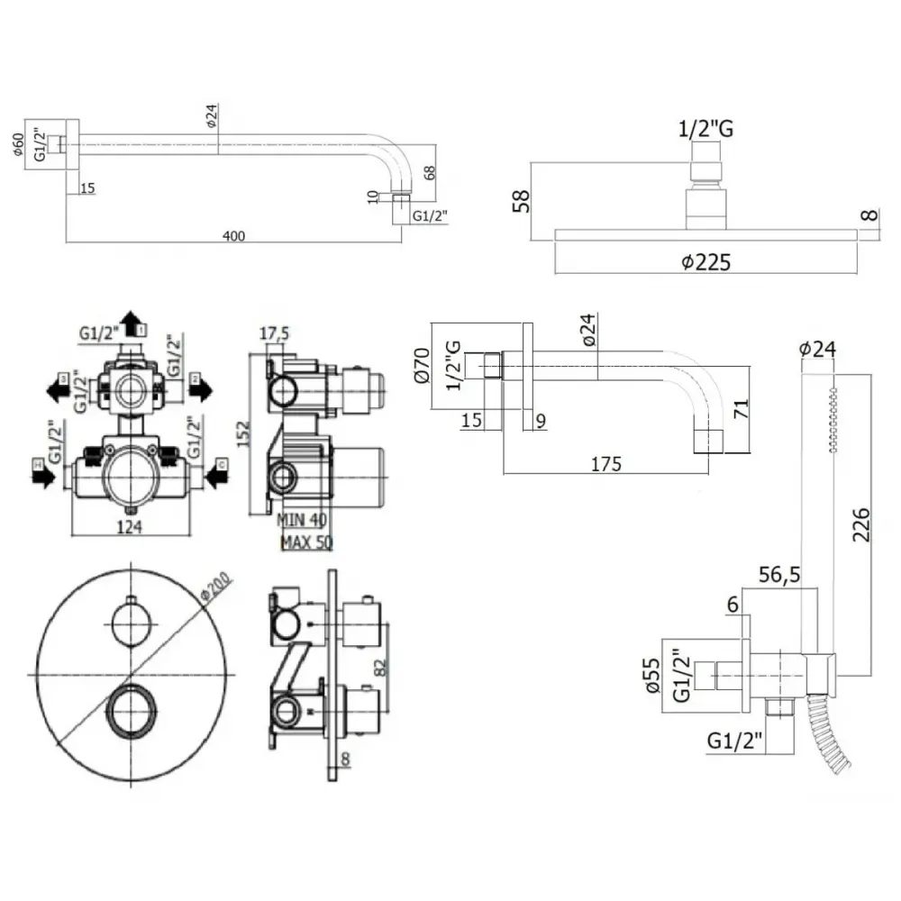 Комплект KITLIQ019CR139 для ванны с изливом 175мм, смеситель LIQ019CR термостат на 3 выхода, душ 225мм, LIGHT, хром Paffoni