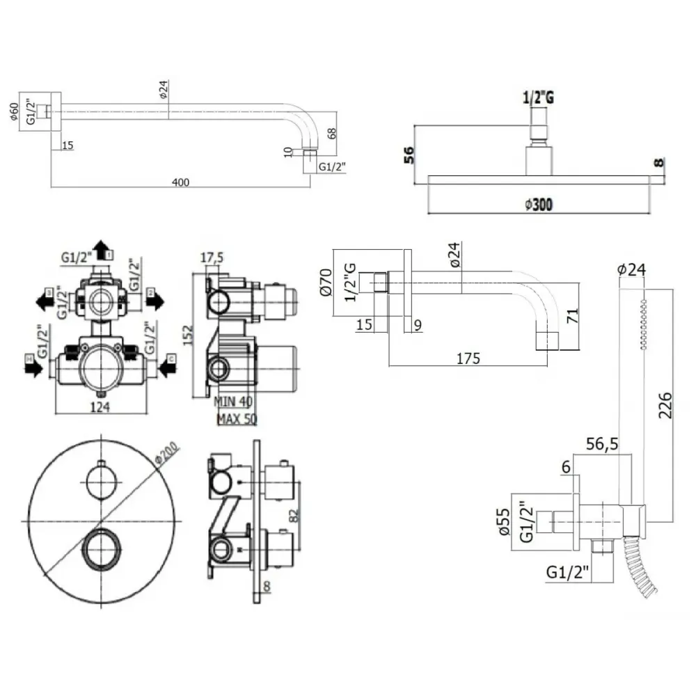 Комплект KITLIQ019CR139KING для ванны с изливом 175мм, смеситель LIQ019CR термостат на 3 выхода, душ 300мм, LIGHT, хром Paffoni