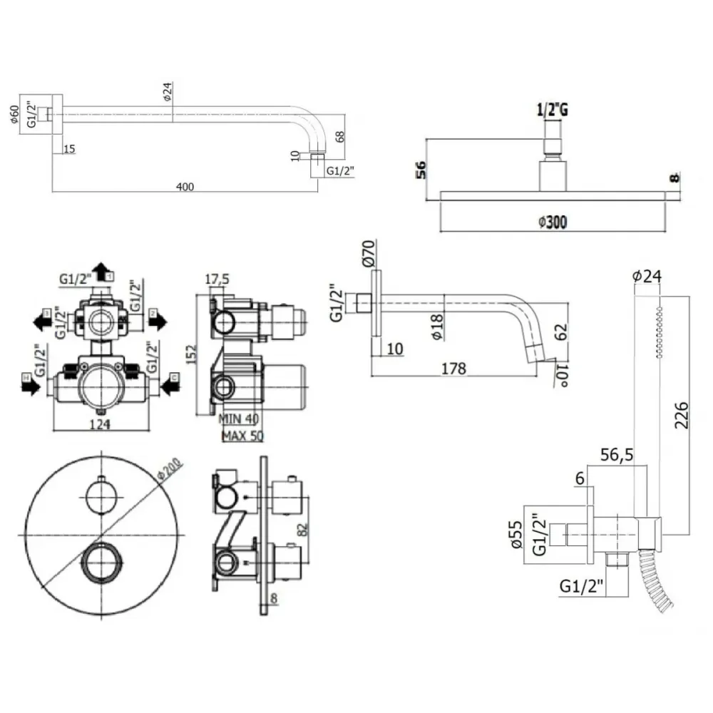 Комплект KITLIQ019NO045KING для ванны с изливом 175мм, смеситель LIQ019NO термостат на 3 выхода, душ 300мм, LIGHT, черный матовый Paffoni