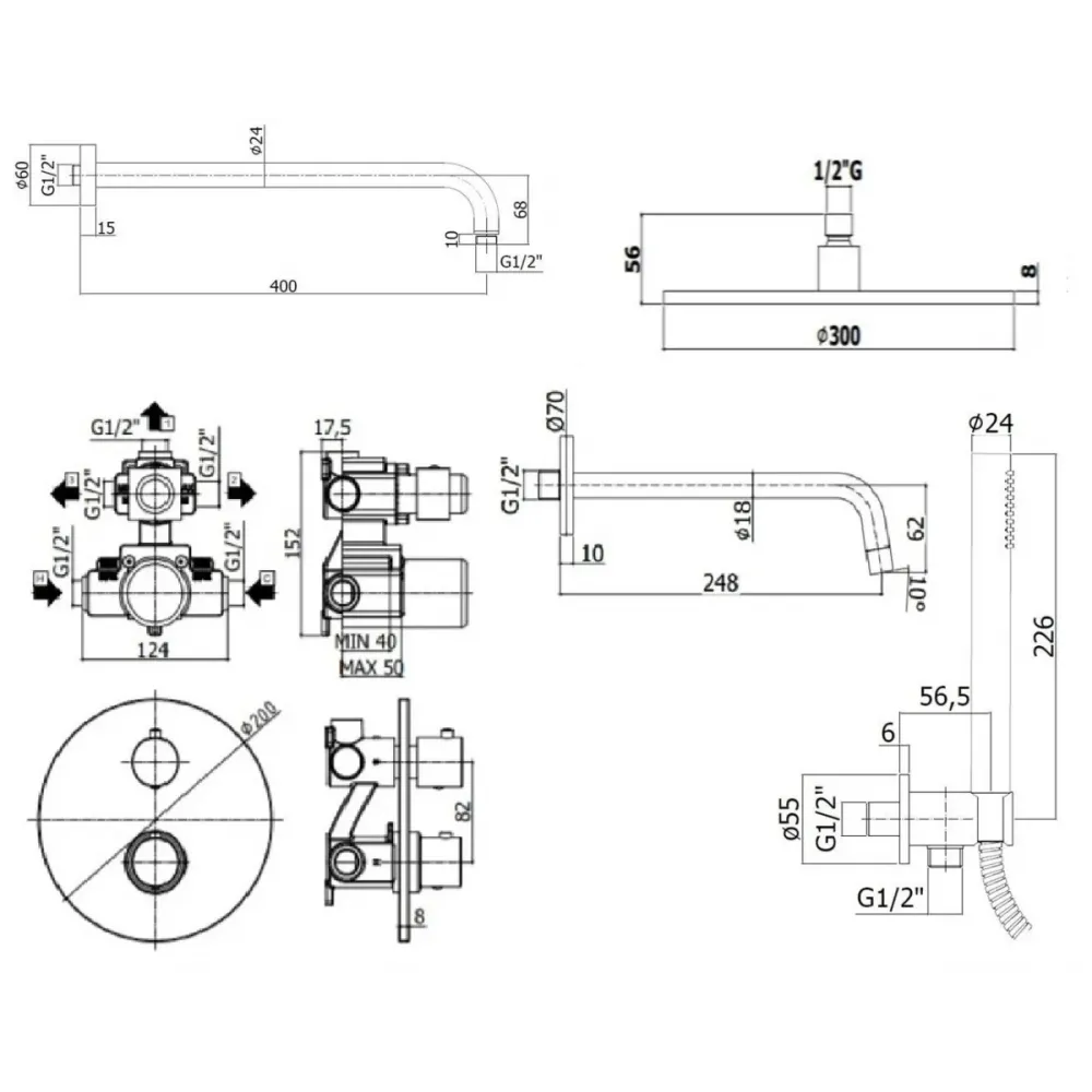 Комплект KITLIQ019NO046KING для ванны с изливом 245мм, смеситель LIQ019NO термостат на 3 выхода, душ 300мм, LIGHT, черный матовый Paffoni