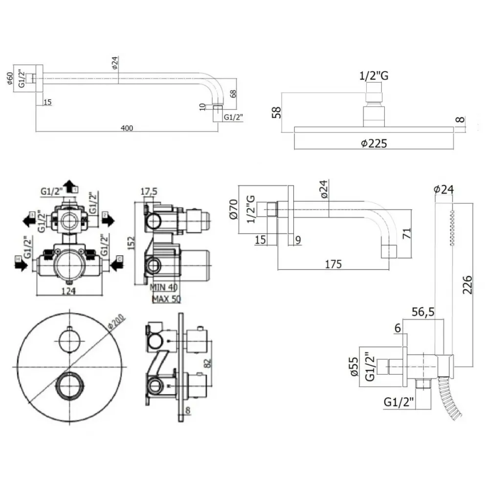 Комплект KITLIQ019NO139 для ванны с изливом 175мм, смеситель LIQ019NO термостат на 3 выхода, душ 225мм, LIGHT, черный матовый Paffoni