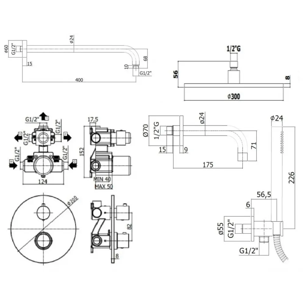 Комплект KITLIQ019NO139KING для ванны с изливом 175мм, смеситель LIQ019NO термостат на 3 выхода, душ 300мм, LIGHT, черный матовый Paffoni