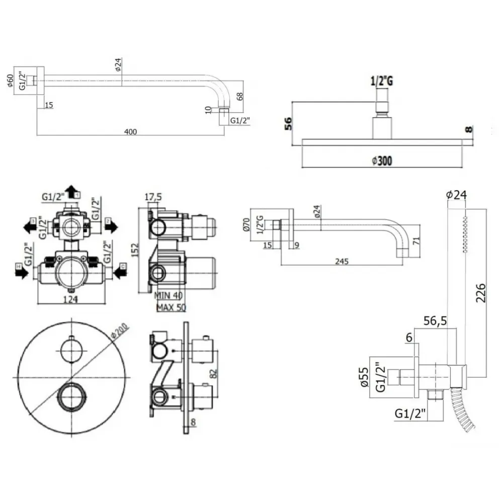 Комплект KITLIQ019NO141KING для ванны с изливом 245мм, смеситель LIQ019NO термостат на 3 выхода, душ 300мм, LIGHT, черный матовый Paffoni