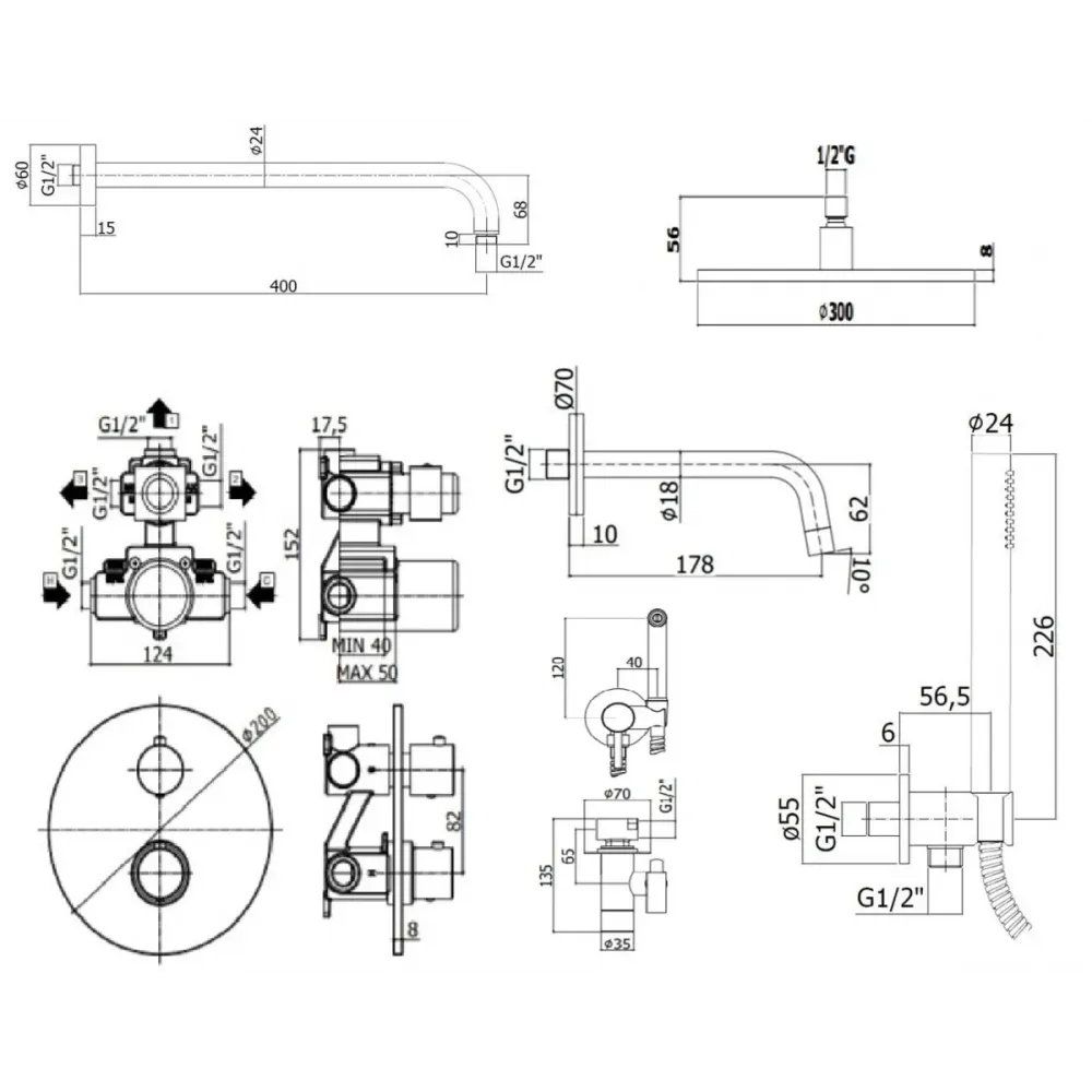 • LIQ019BO Смеситель термостат встраиваемый для душа 3 выход с накл.металл диам.200мм, девиатор-картридж, 3 положения+3 комбо со стоп, белый матовый, Pa