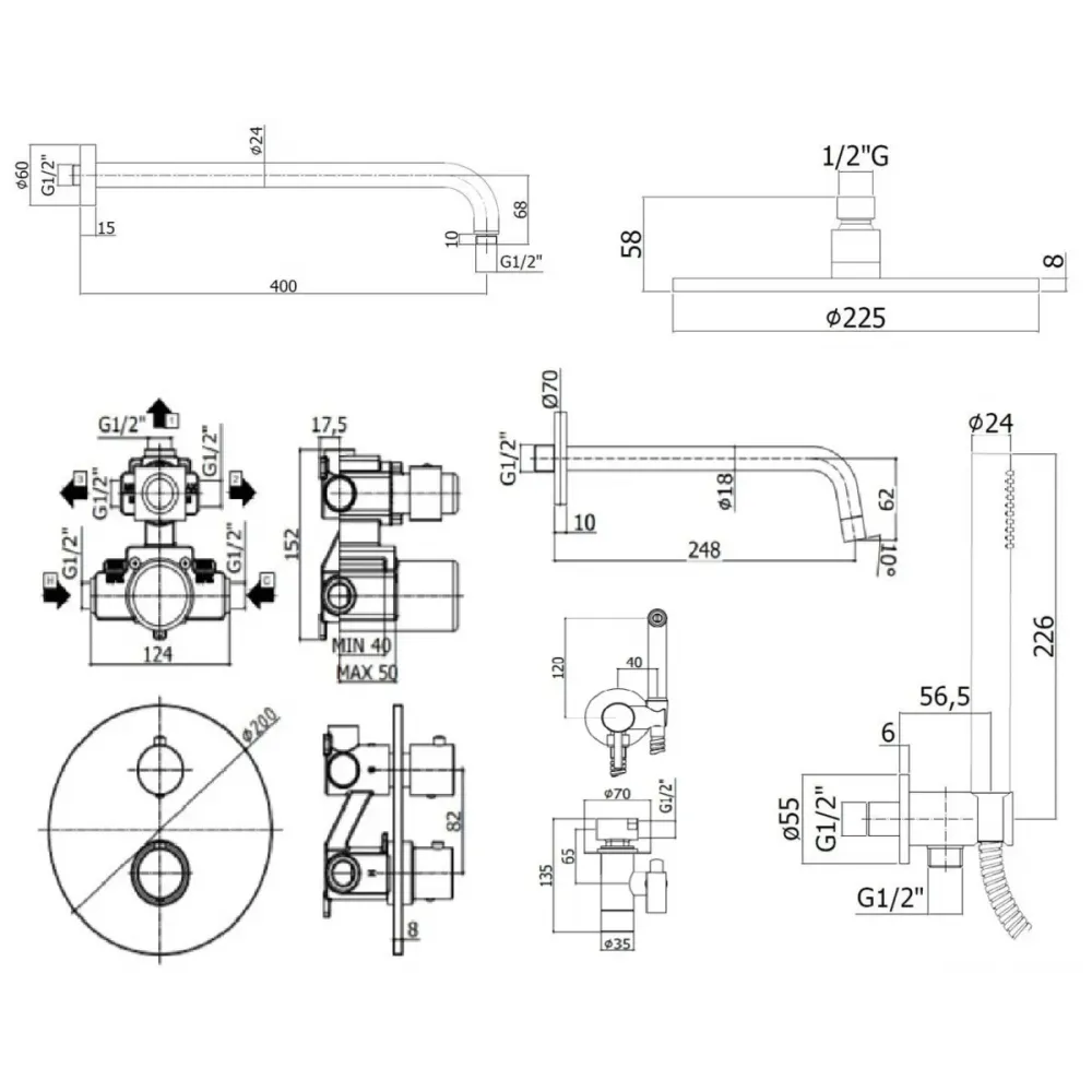 • LIQ019BO Смеситель термостат встраиваемый для душа 3 выход с накл.металл диам.200мм, девиатор-картридж, 3 положения+3 комбо со стоп, белый матовый, Pa